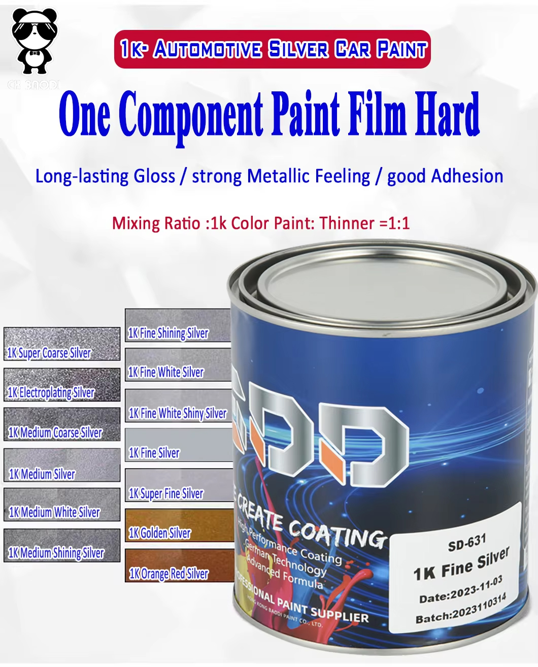 SD-631 1K Fine Silver Features: The Product Has Higher Consistency and High Quality and is Used Has Base Coat Series of Double Bedding System and Three bedding System. it Has Excellent Covering Power,even Arrangement of Metallic Effect Pigment Has No Flowering and Can Beconveniently Constructed.